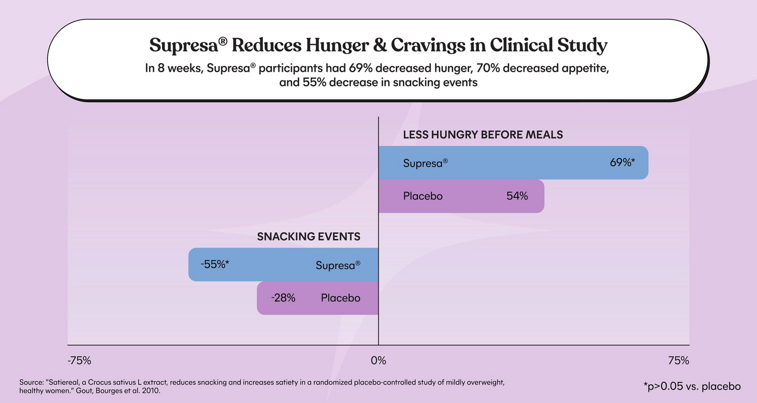 Reduce snacking in as early as 30 days with patented and clinically-studied Supresa® saffron extract. Within 8 weeks, Supresa® study participants also showed 69% decrease in hunger.