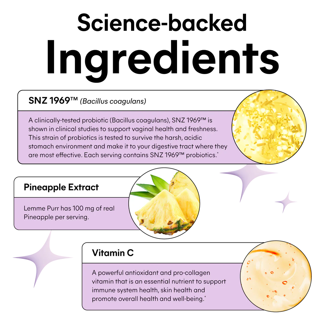 Lenust Purr is formulated with a clinically-studied dose of SNZ 1969™ probiotics, demonstrated to support vaginal health.* Additionally, our gummies include 100 mg of real Pineapple Extract (per serving) and antioxidant Vitamin C.